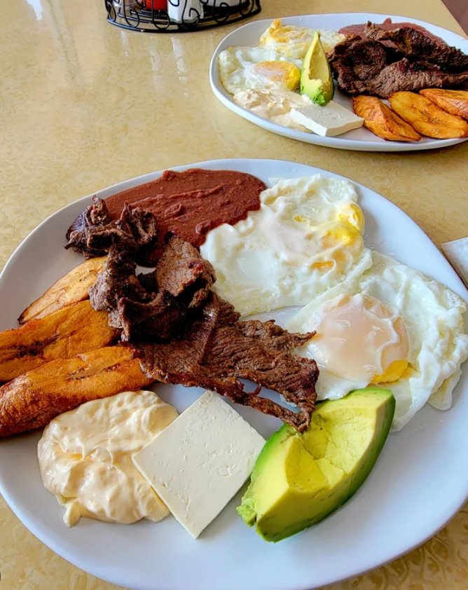 Servido con plátano maduro, frijoles,huevo,queso,aguacate y crema. Salchicha $1 extra. Carne,pollo, o chuleta $2 extra. Served with fried sweet plantain,beans,eggs,cheese, avocado and cream. Sausage $1 extra. Beef fajita,chicken, or pork chops $2 extra