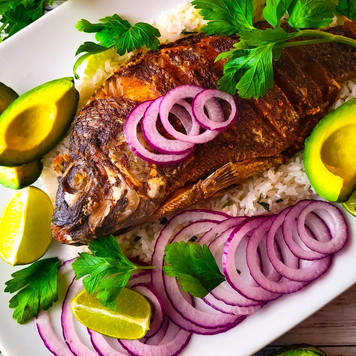 Servido con chimol, aguacate, queso, frijoles, arroz,curtido, y tajadas de guineo verde. Fried fish with fried banana slices,beans,rice, pico de gallo, onions, red sauce and honduran dressing .