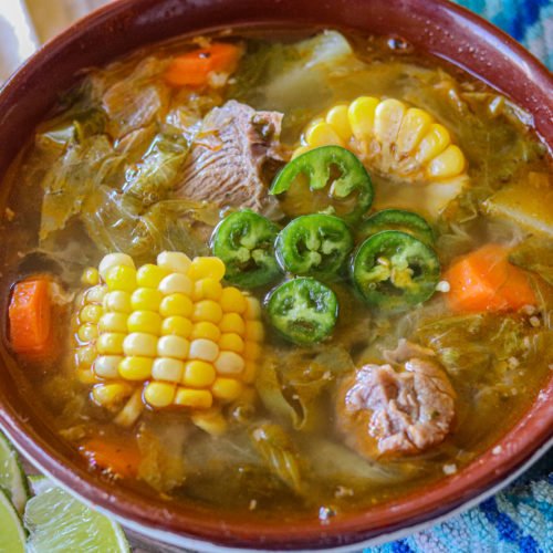 Sopa de res con papa, elote, calabaza, zanahoria. Acompañado con arroz y tortilla. Beef Booth with patatoes,corn,zucchini, carrots. Served with rice and tortilla.